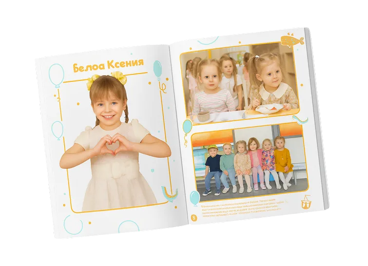 Мы предлагаем 13 дизайнерских вариантов оформления, среди которых «Рисунки», «Пиксель», «Африка», «Игрушки» и другие. Каждый альбом включает в себя портреты воспитанников, виньетки всей группы, кадры с мероприятий и фотографии воспитателей.