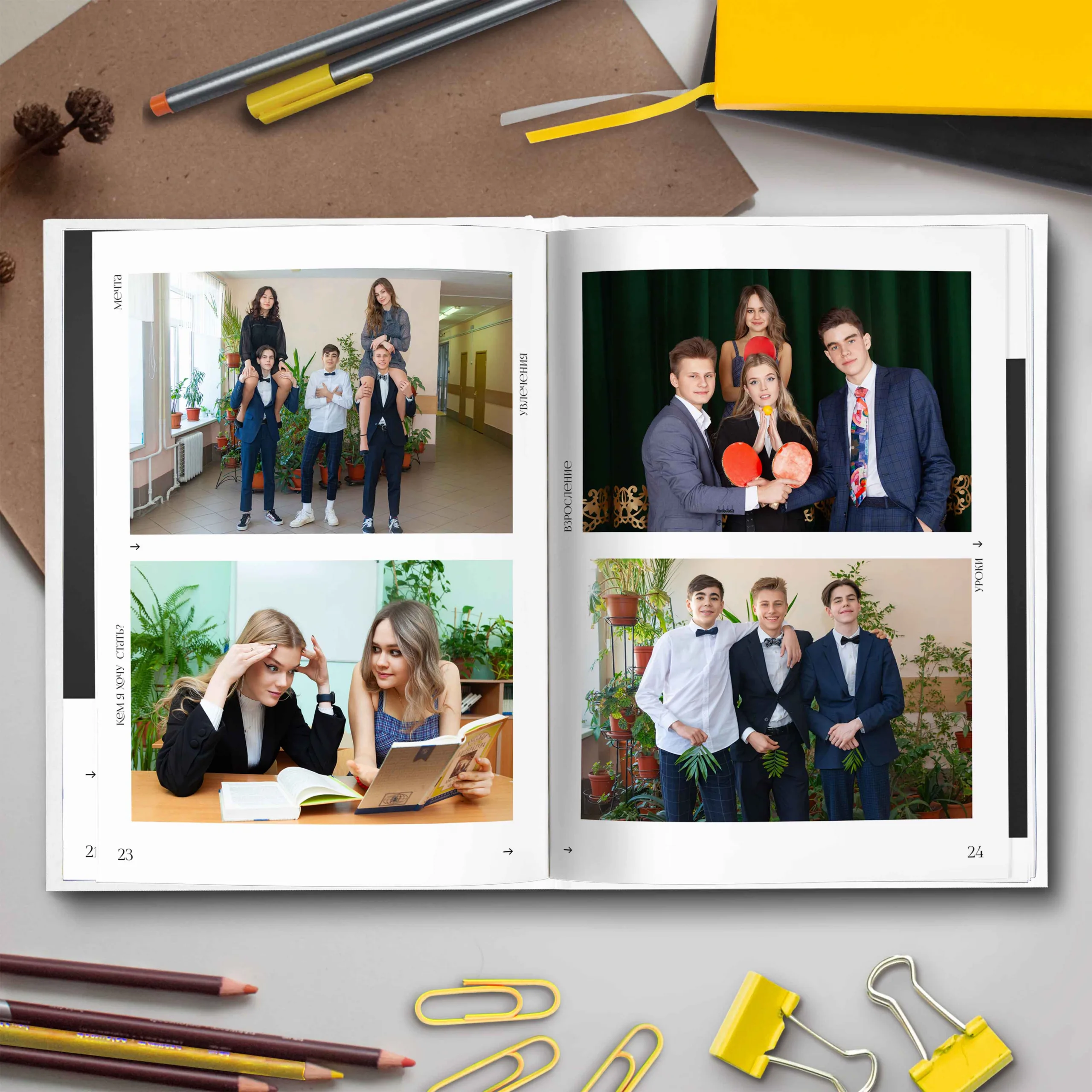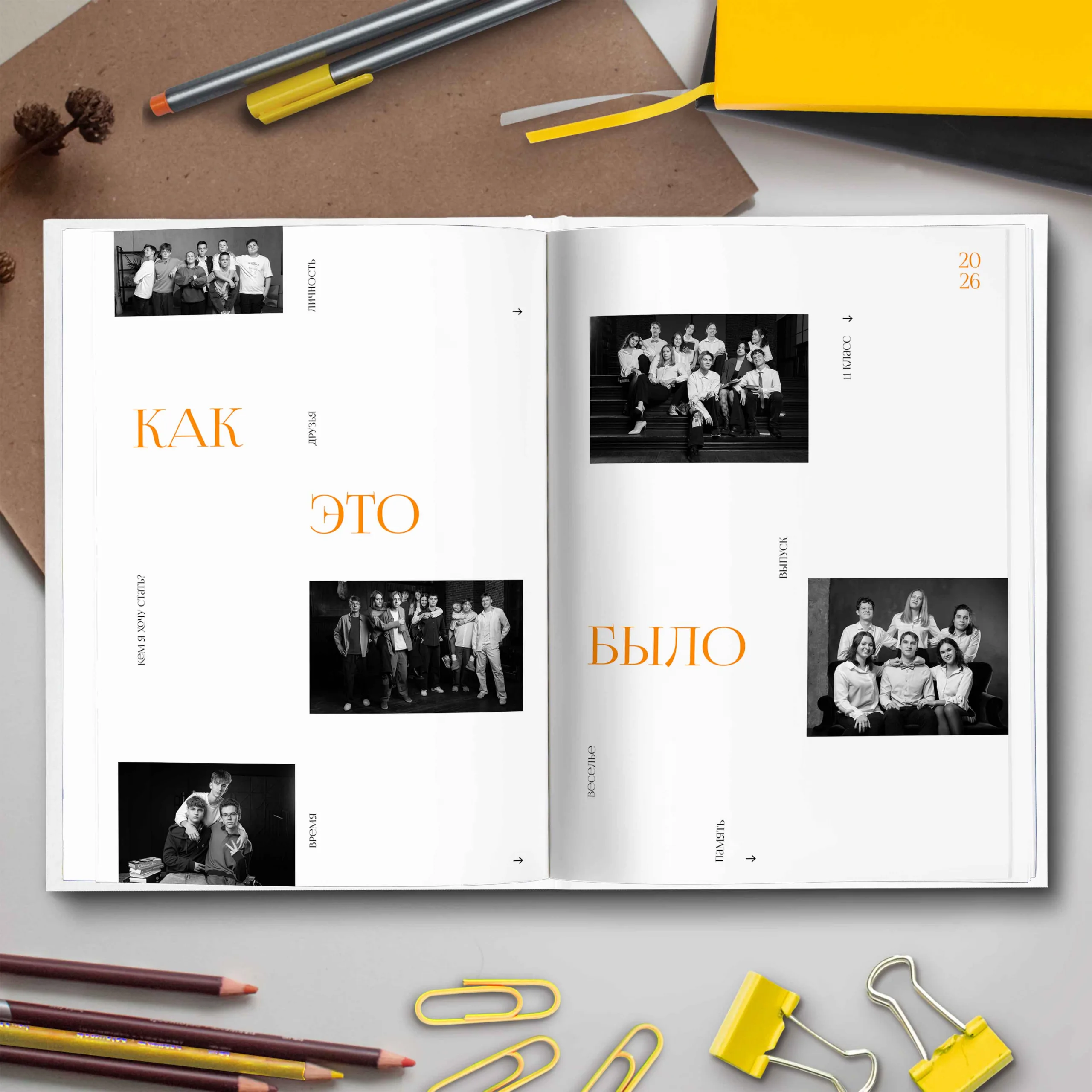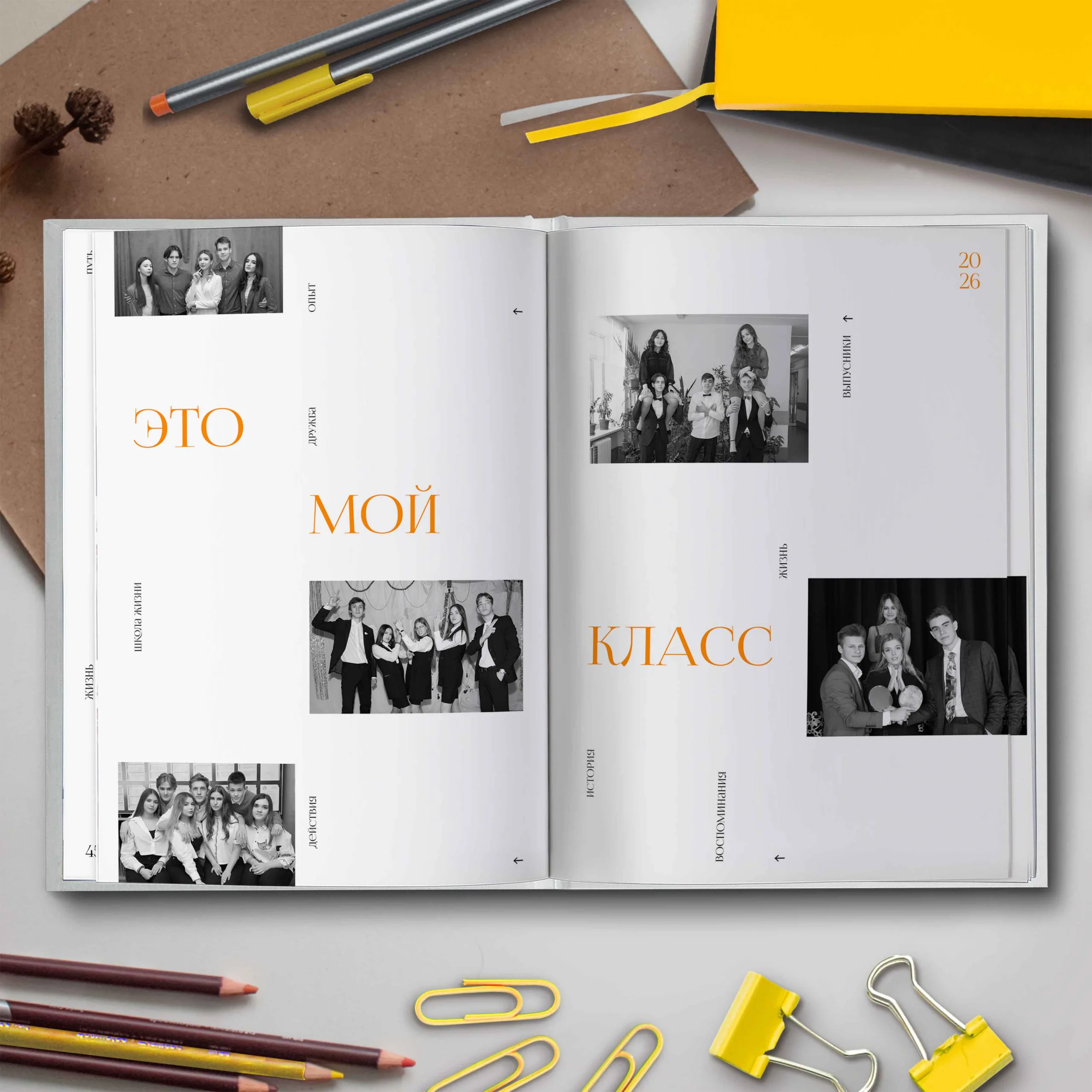 1ый разворот — форзац с использованием случайных фотографий общего репортажа