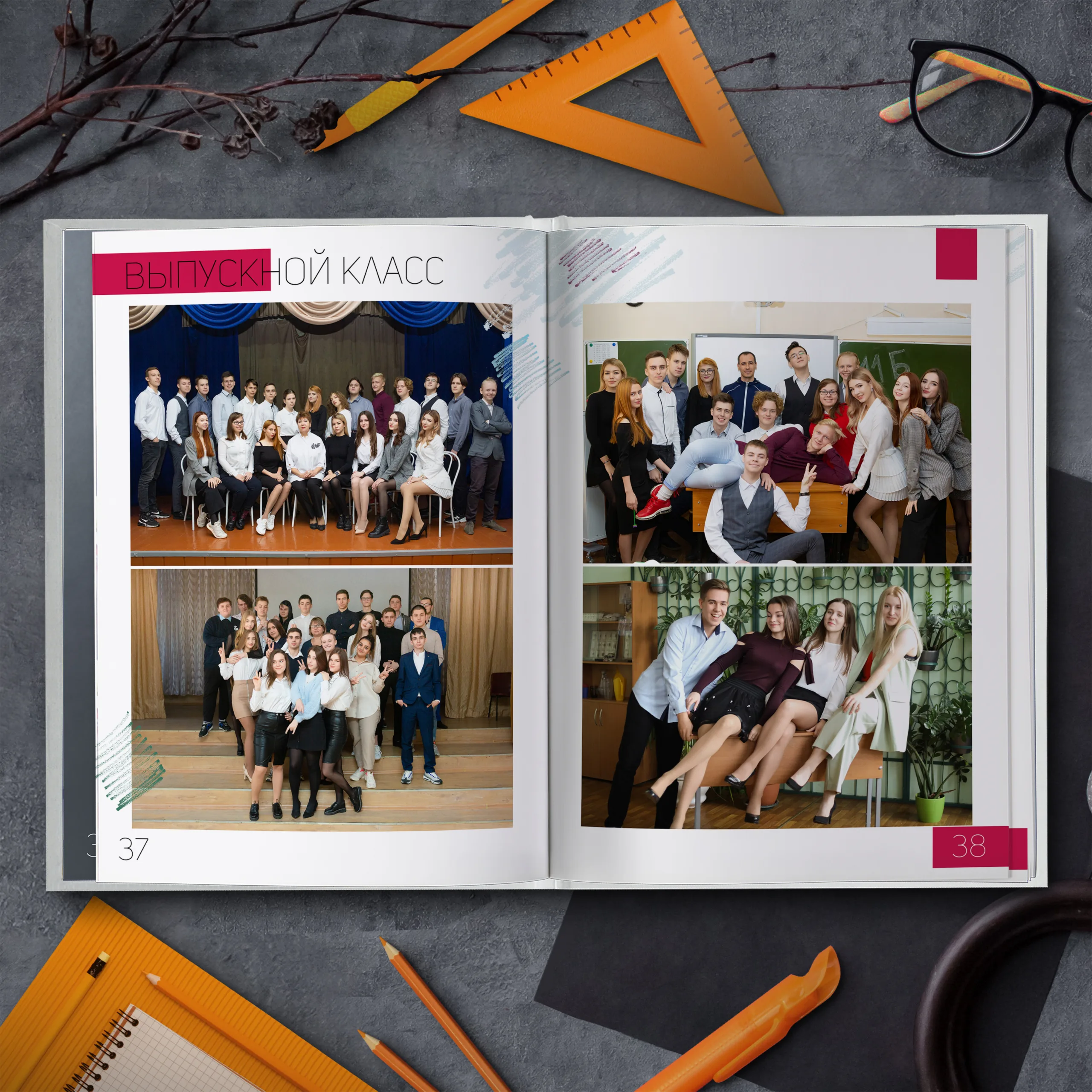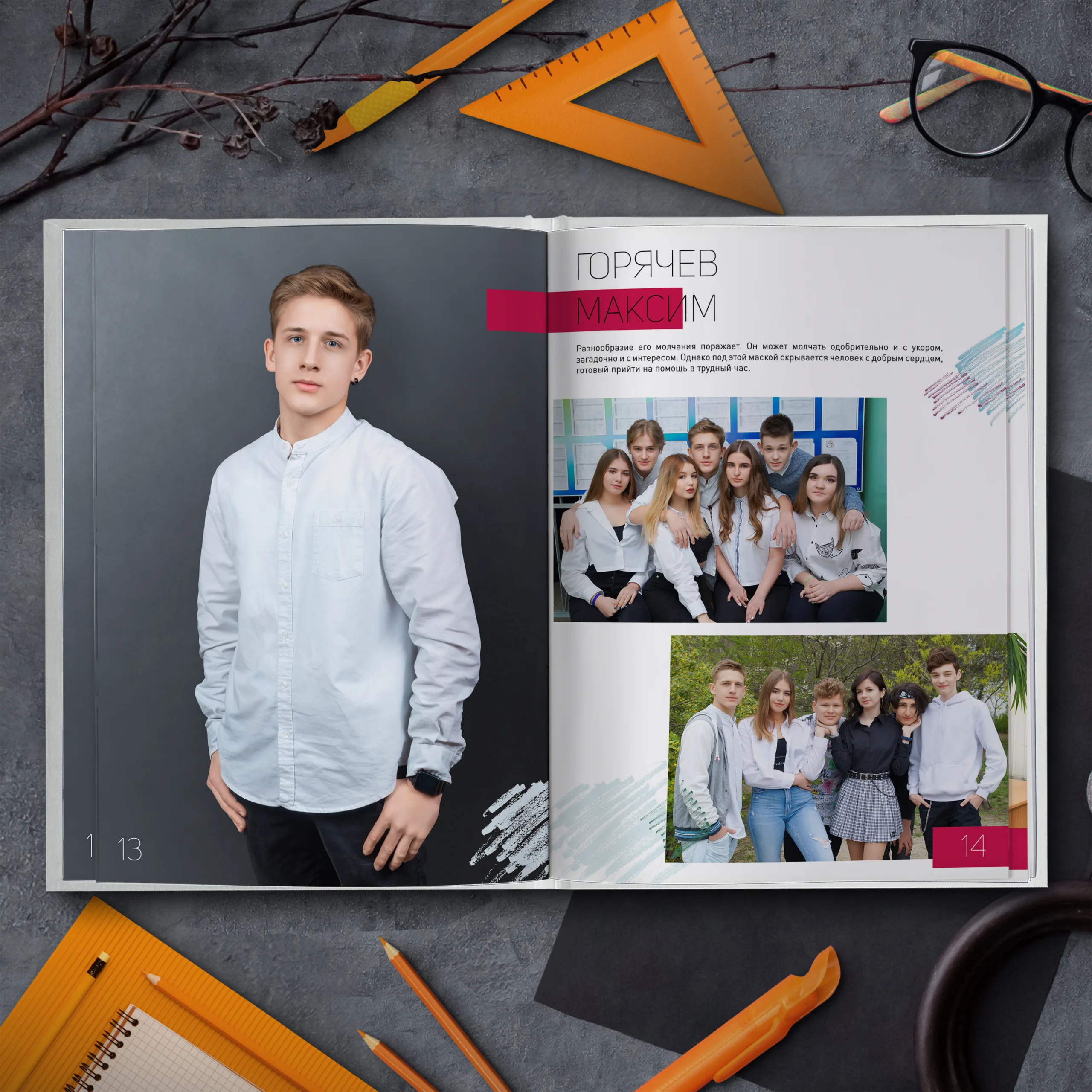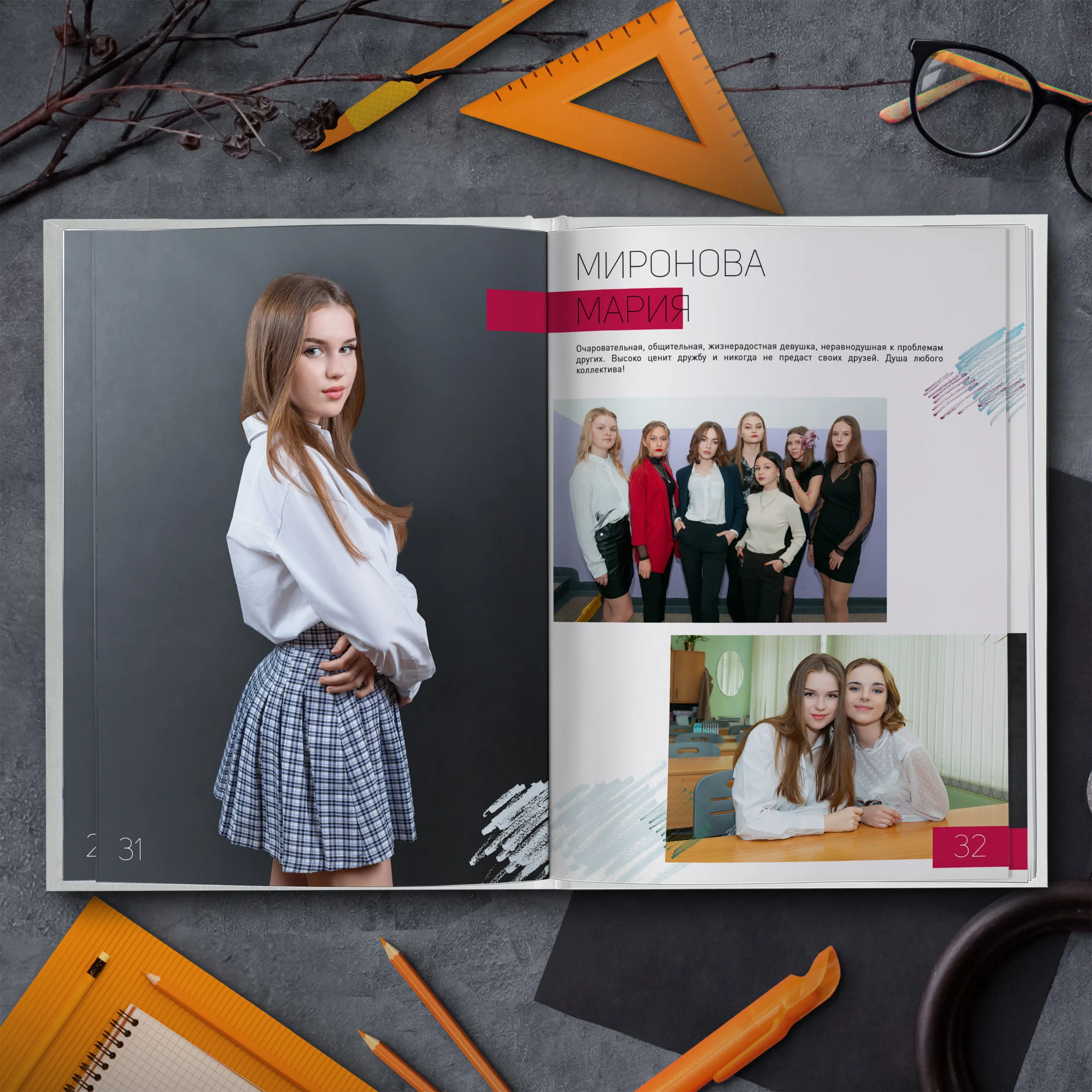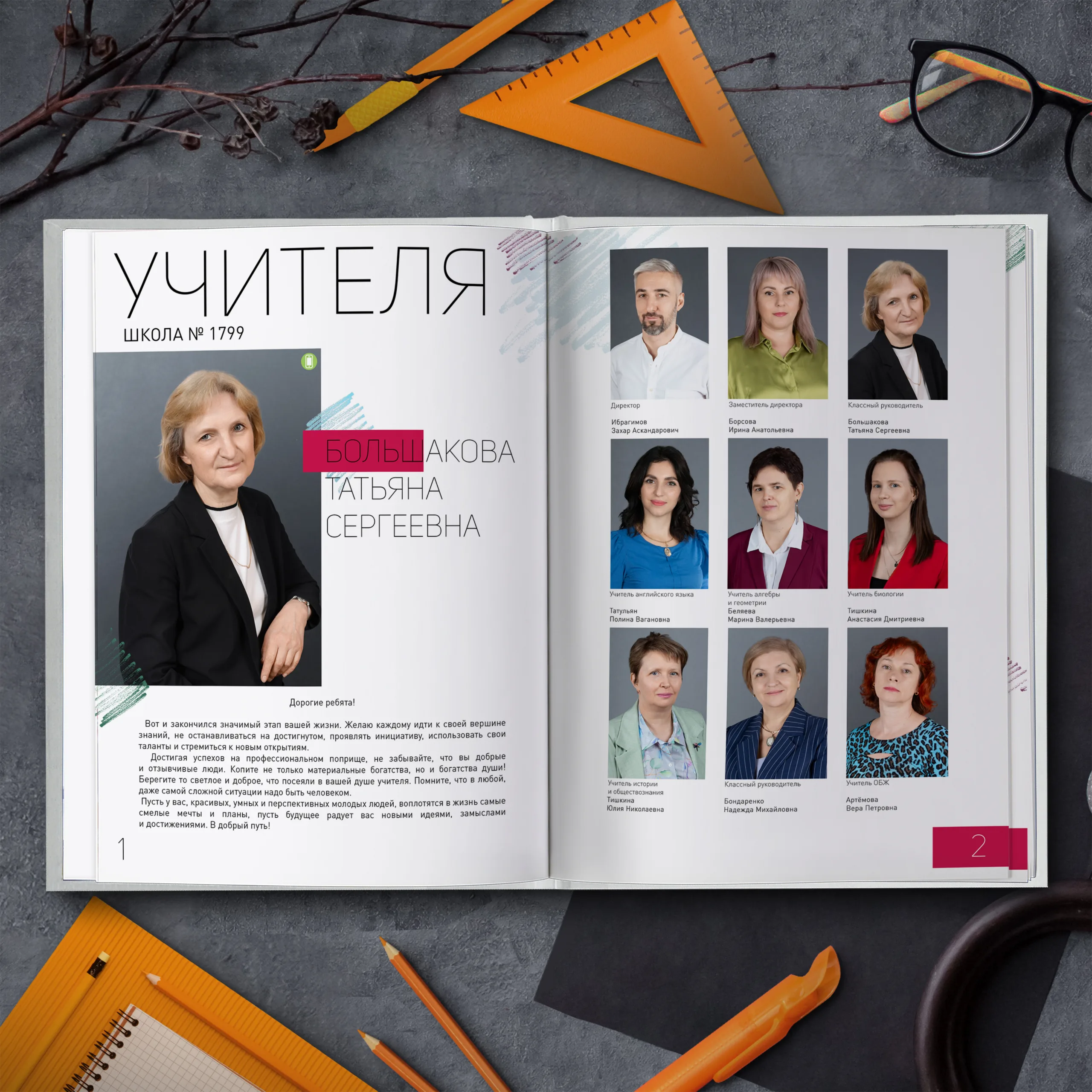 1ый разворот — портрет классного руководителя с напутственным словом и виньетки учителей