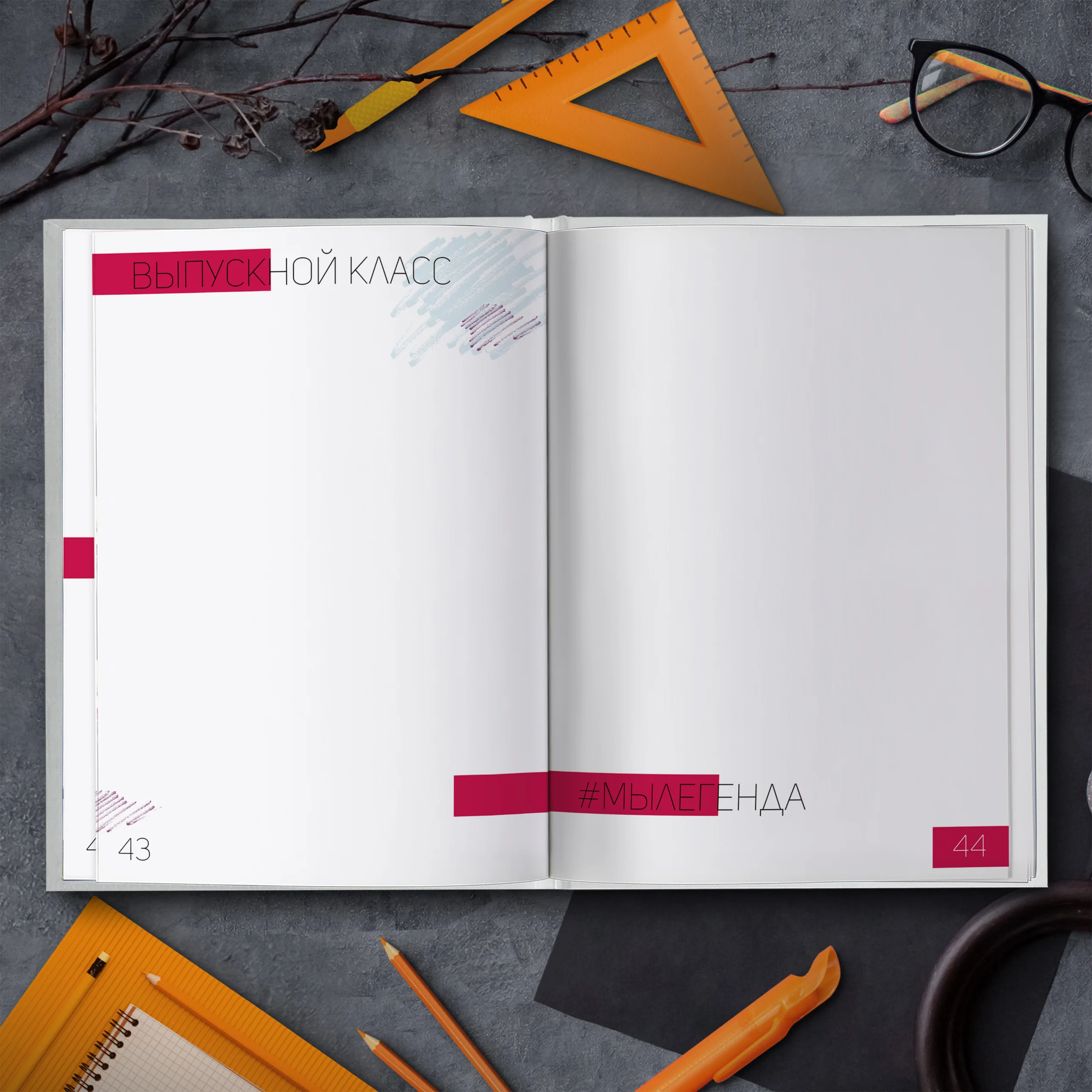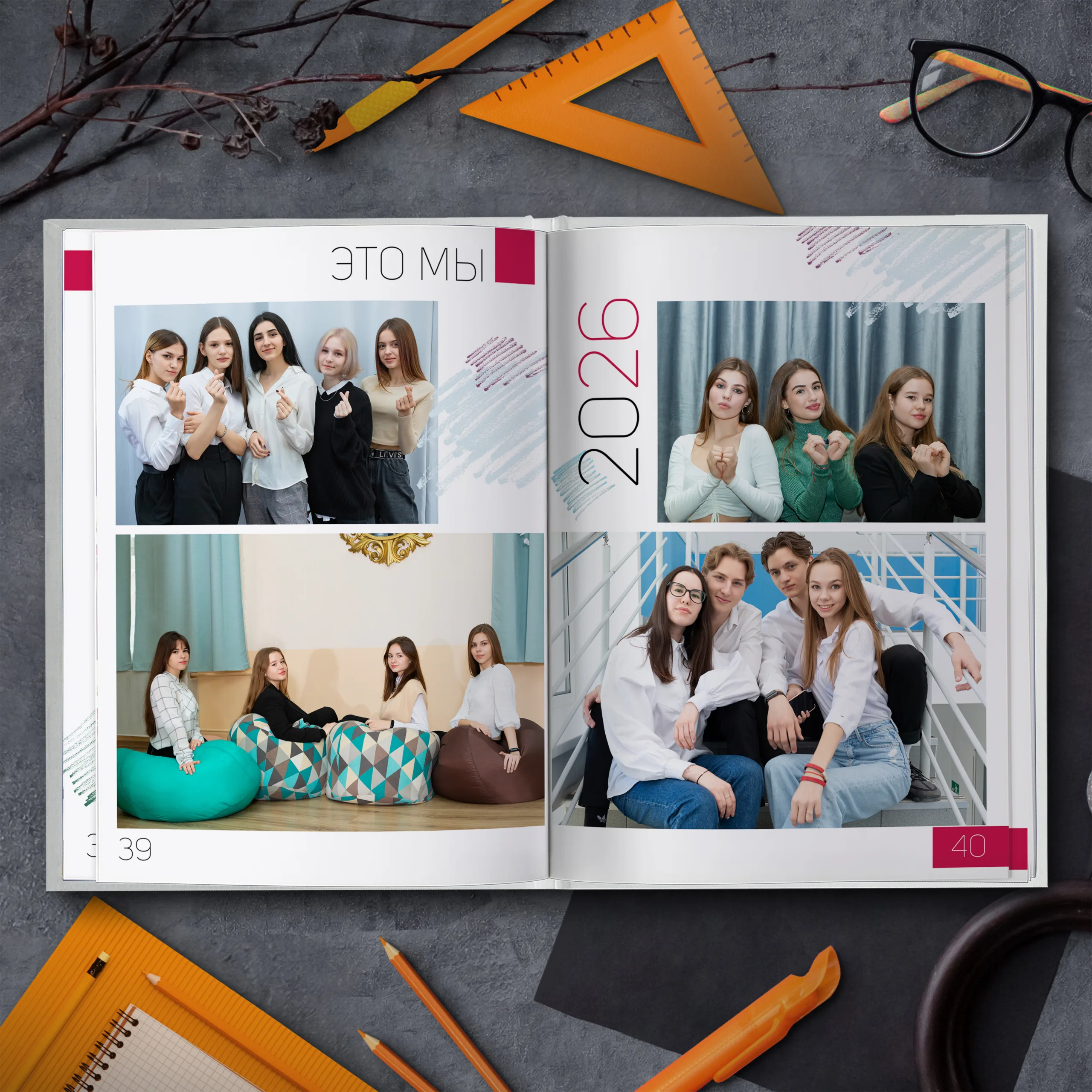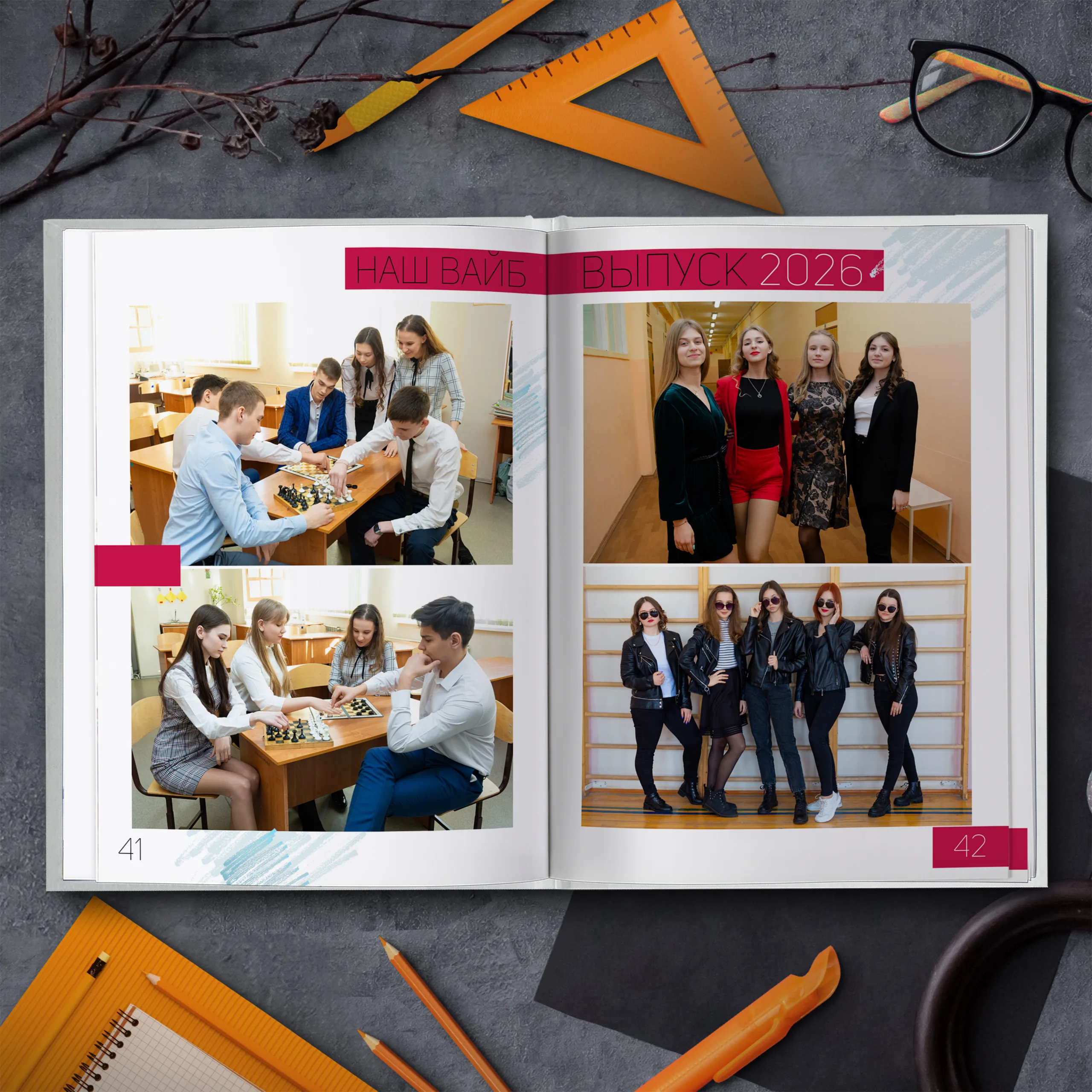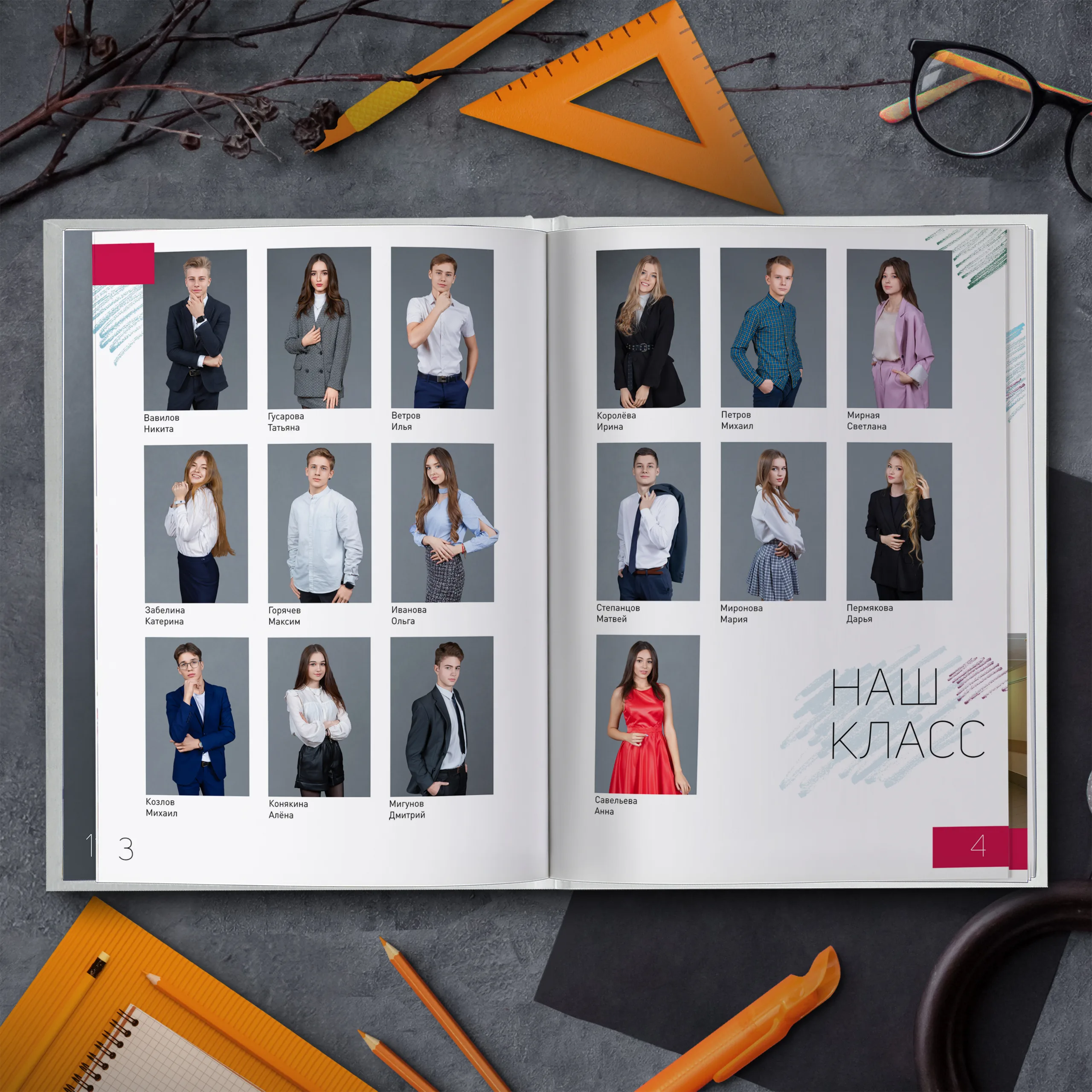 1ый разворот — портрет классного руководителя с напутственным словом и виньетки учителей