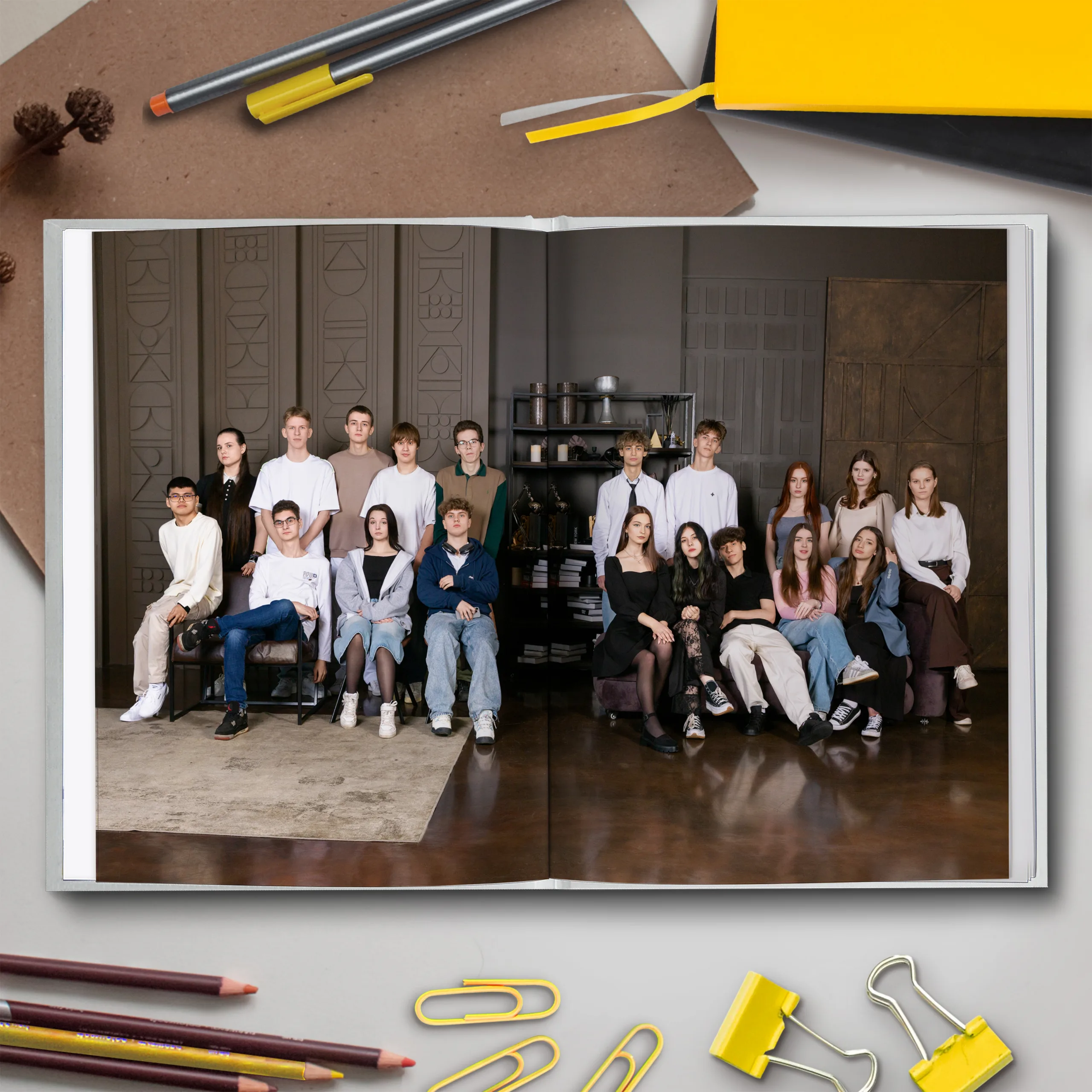 1ый разворот — форзац с использованием случайных фотографий общего репортажа